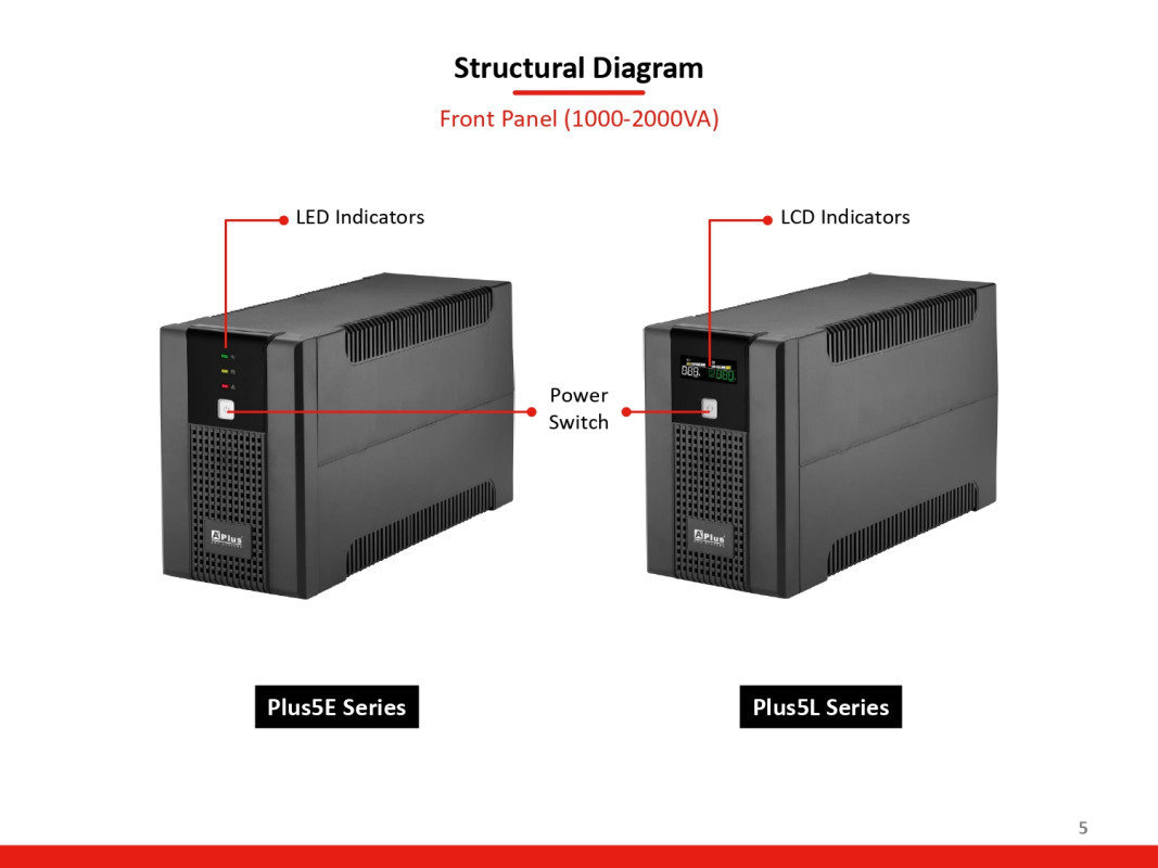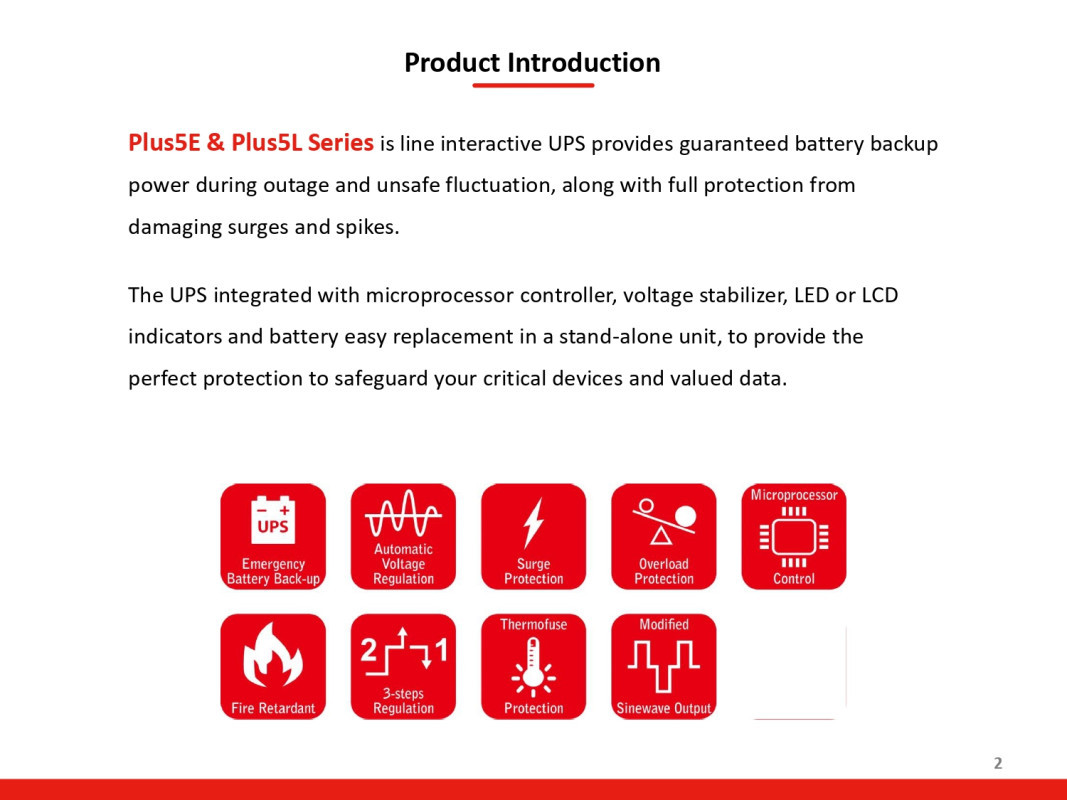 توفر سلسلة Plus5L من Line Interactive UPS, 1500VA/900W فولت أمبير طاقة احتياطية مضمونة للبطارية أثناء انقطاع التيار والتقلبات غير الآمنة، إلى جانب الحماية الكاملة من الزيادات المفاجئة والارتفاعات الضارة. حجرة البطارية الفريدة تجعل من السهل والسريع وتوفير المال تغيير البطارية. تتميز بقدرة 600 فولت أمبير إلى 2000 فولت أمبير مدمجة مع وحدة تحكم المعالجات الدقيقة ومثبت الجهد وشاشة LCD واستبدال البطارية بسهولة في وحدة قائمة بذاتها، تعد UPS سلسلة Plus5L الخيار الأفضل لحماية بياناتك وإبقائك على اتصال أثناء انقطاع التيار الكهربائي.