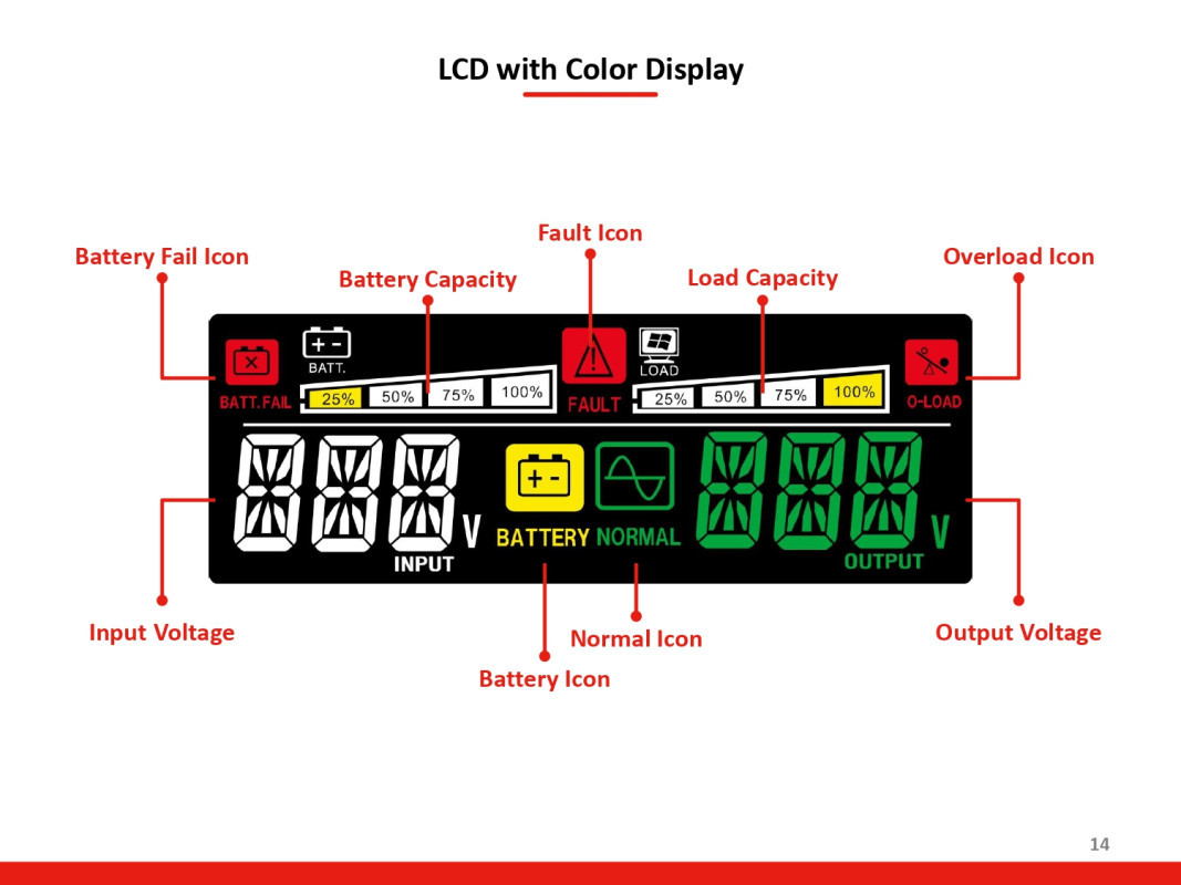| مؤشرات حالة شاشات الكريستال السائل | جهد الإدخال، جهد الخرج، مستوى التحميل، مستوى البطارية، الخطأ، فشل البطارية، التحميل الزائد، التيار المتردد العادي | |||||