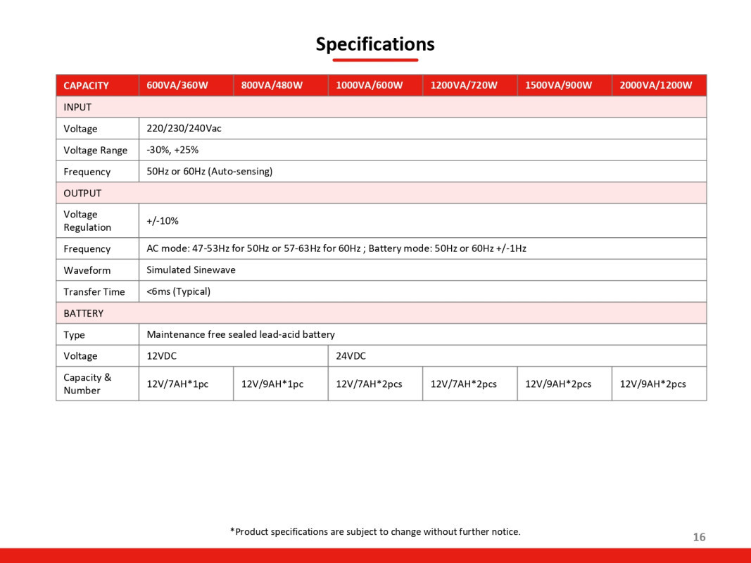 | سعة | 600 فولت أمبير/360 واط | 800 فولت أمبير/480 واط | 1000 فولت أمبير/600 واط | 1200 فولت أمبير/720 واط | 1500 فولت أمبير/900 واط | 2000 فولت أمبير/1200 واط |