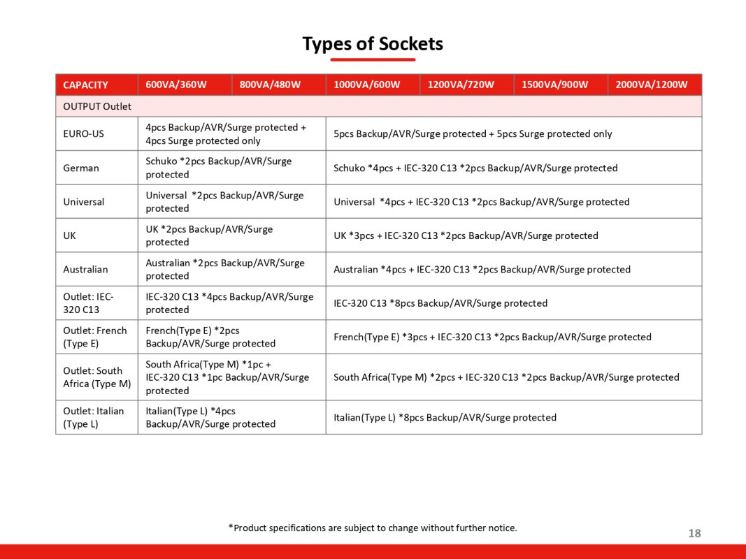| مَنفَذ | Schuko *2 قطعة احتياطية/AVR/محمية من زيادة التيار | Schuko *4 قطع + IEC-320 C13 *2 قطعة احتياطية/AVR/محمية من زيادة التيار | ||||