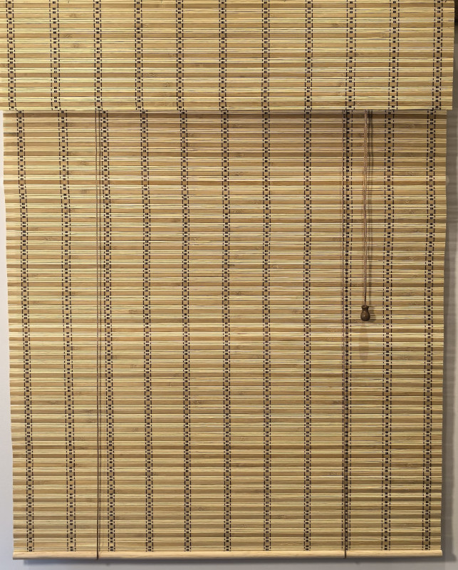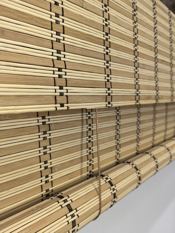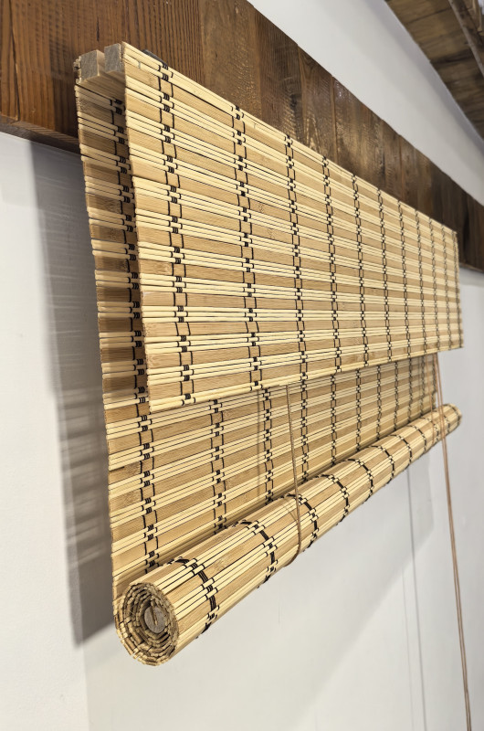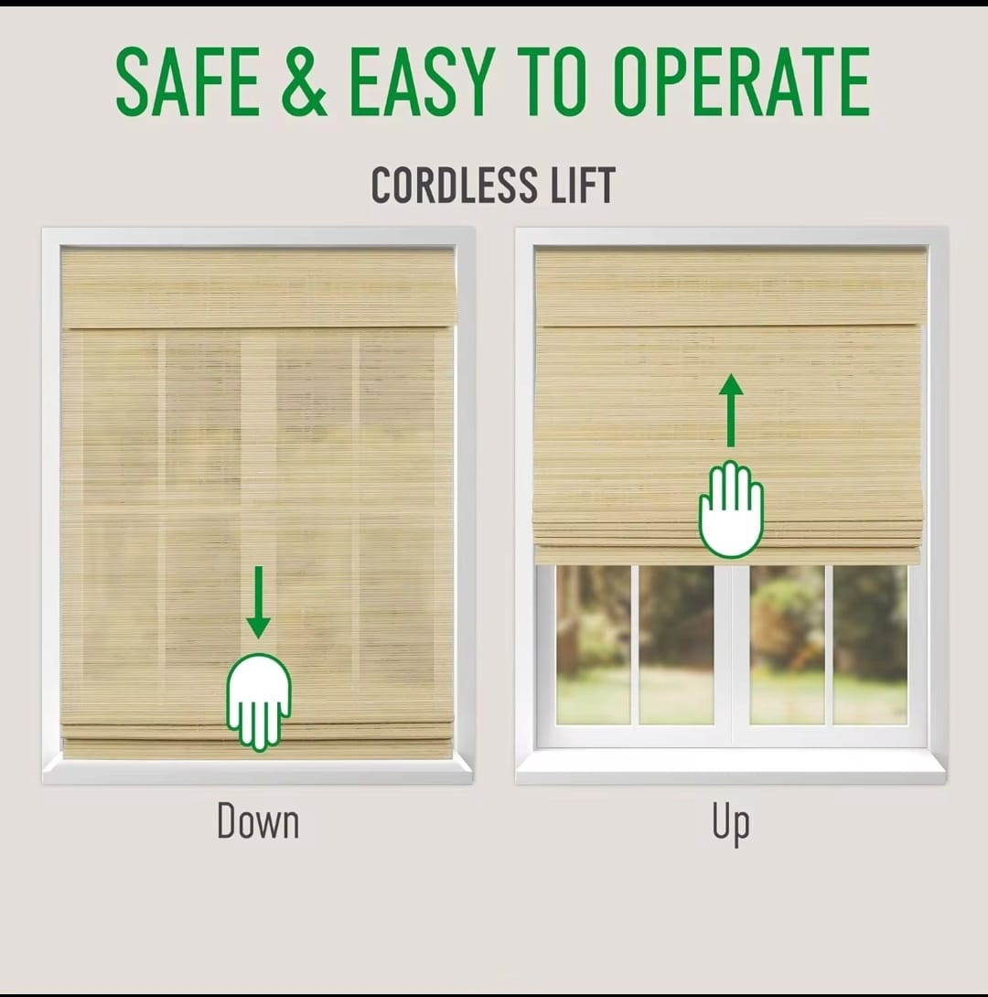 Natural bamboo roller blinds, foldable, breathable, UV protection, blackout window curtains, light reflective, all mounting hardware included.