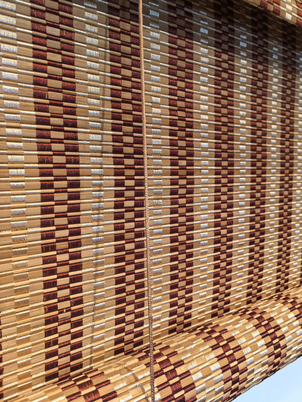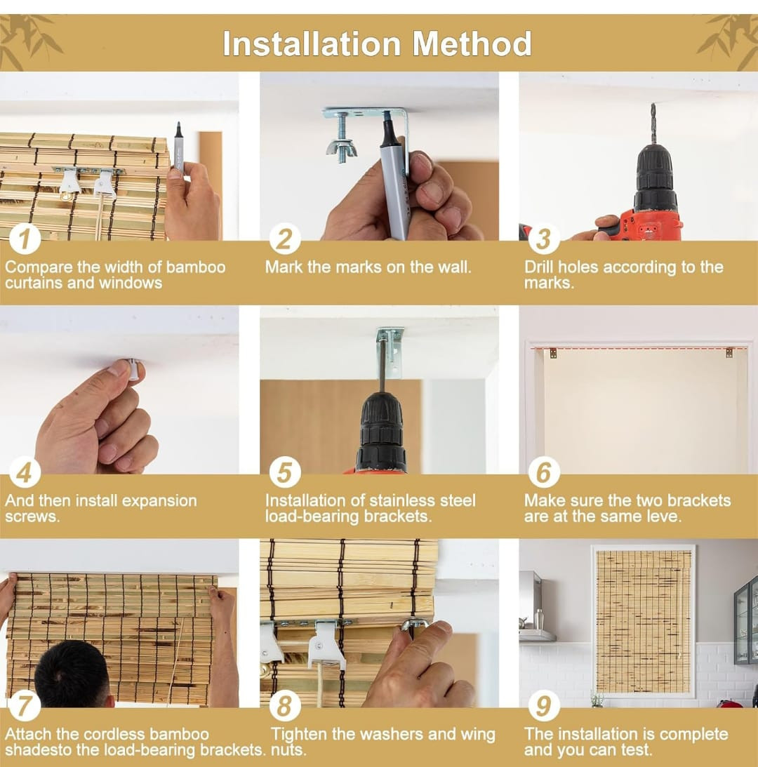 Natural bamboo roller blinds, foldable, breathable, UV protection, blackout window curtains, light reflective, all mounting hardware included.